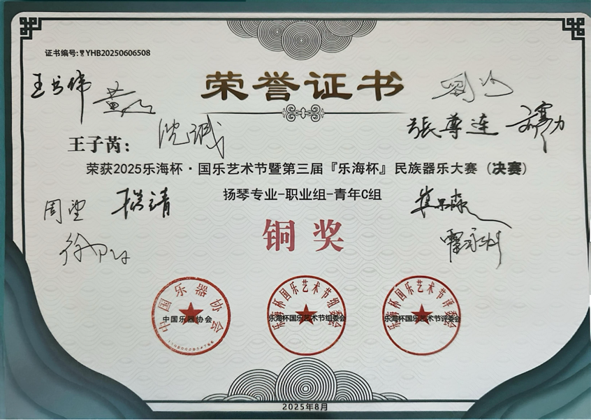 历经初赛、复赛两轮激烈角逐,王子芮同学最终荣获第三届「乐海杯」民族器乐大赛职业组铜奖。这一优异成绩不仅彰显了其扎实的专业功底,更为我院音乐类研究生竞赛的器乐方向带来了新的突破。