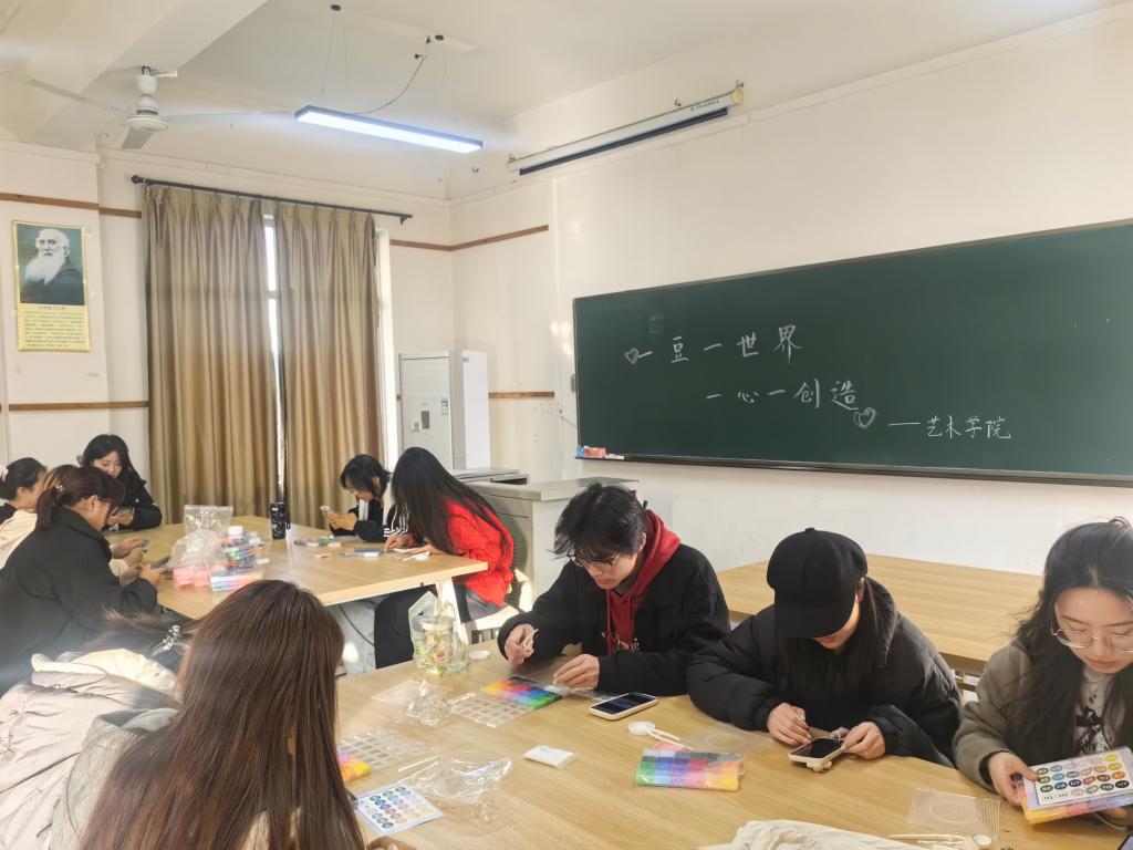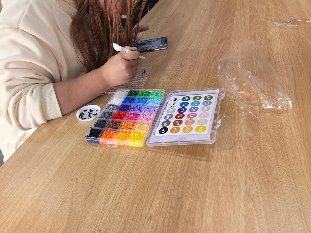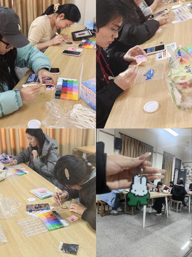 活动伊始,组织者借助轻松的破冰环节和基础教学,引领同学们逐渐远离电子屏幕,全身心沉浸于拼豆创作所带来的“心流”体验之中。在随后的 DIY 环节,同学们尽情发挥自身的想象力与创造力,精心构思图案、细致布局色彩。在静谧且专注的氛围中,大家相互协作、交流经验,现场气氛温馨而融洽。