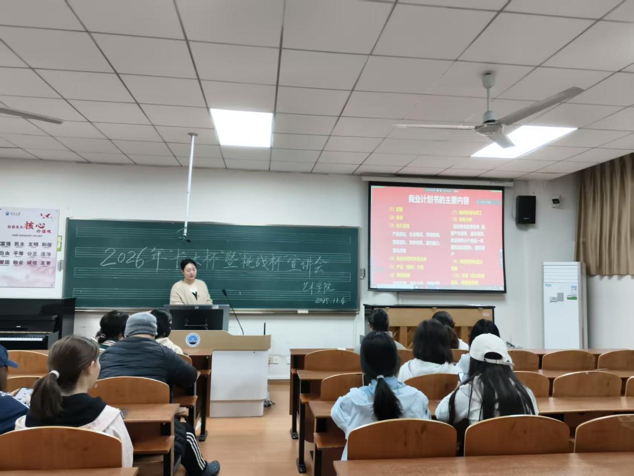 会上,杨锐老师围绕“赛事赋能成长”这一核心,详细介绍了“挑战杯”竞赛的历史沿革、赛事章程、获奖情况以及重要意义,同时对商业计划书的撰写给予了指导。她着重强调,“挑战杯”不仅是展现高校育人成果的重要窗口,更是培养学生创新精神、实践能力与团队协作能力的平台。她希望同学们能够把握机会,勇于挑战。