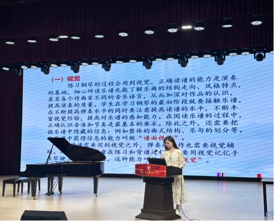 演奏结束后,饶教授从“视觉”方面先解析,强调“谱面视觉”对曲式结构、作曲家意图的挖掘价值,指出读谱需兼顾音准节奏与隐性信息,并且对比不同触键产生的音色差异,阐释内心“听觉”对演奏反馈的指导意义,“耳朵需先于手指感知目标音色,才能实现从技术到艺术的跨越”最后剖析并总结“触觉”是音色的直接塑造者,需根据音乐动态调整速度、力度与角度。