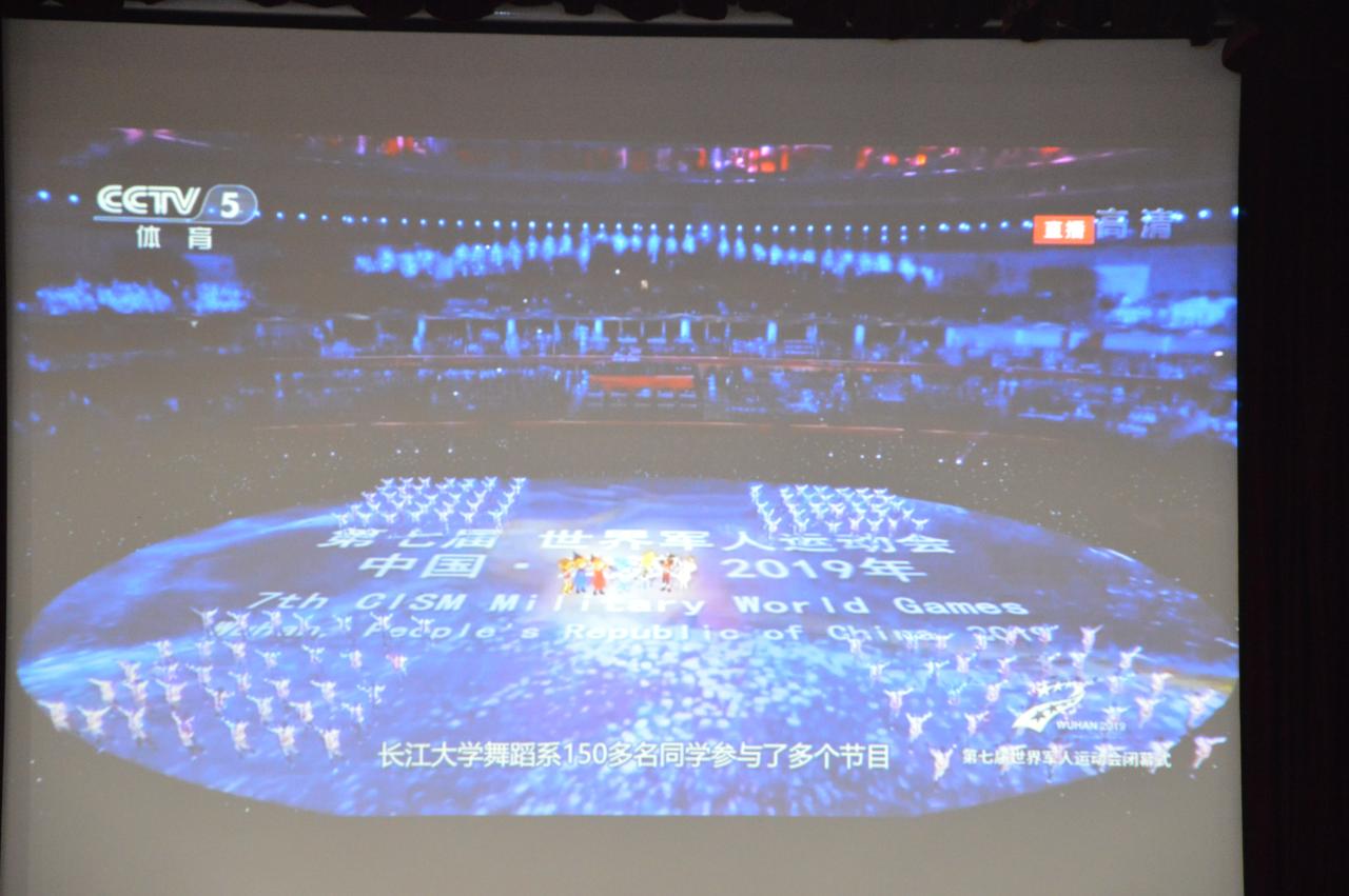 (通讯员:陈渊宇) 在湖北省武汉市举办的第七届世界军人运动会早已落下帷幕,而在精彩绝伦的闭幕式演出中,十个节目有九个都是由我院舞蹈系的150名学子参与完成的。为对他们进行表彰,我院于2019年11月15日下午2点半在太阳集团2007网站东校区十一教报告厅举行了太阳集团2007网站,太阳集团网址2007登录第七届世界军人运动会闭幕式演出事迹分享暨表彰大会。莅临本次大会的领导和嘉宾有太阳集团2007网站党委副书记、纪委书记蒋光忠、团委副书记秦良斌、太阳集团2007网站党委书记王学峰、副院长马春明、彭琛、舞蹈系全体老师、辅导员,以及参与本届军运会闭幕式演出的150名舞蹈系的同学们。