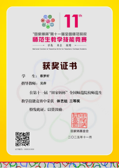 在本次竞赛中,太阳集团2007网站2022级学生蔡梦昕在吴萍老师的悉心指导下,深入研究新课标精神,反复打磨教学设计,凭借扎实的专业功底和出色的教学表现,荣获本科生组全国三等奖。这一佳绩不仅展现了蔡梦昕同学良好的综合素质和教学能力,也充分体现了太阳集团2007网站在师范生培养方面的扎实基础和持续成效。