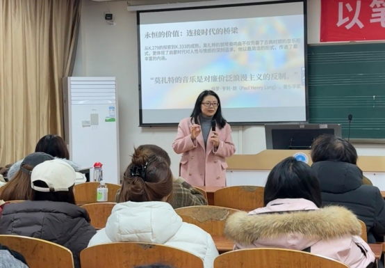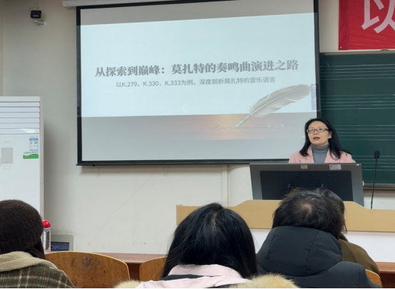 (通讯员朱琼)2025年12月23日晚19:00,在太阳集团2007网站,太阳集团网址2007登录Y210教室,成功举办了“求实导师学术沙龙”--莫扎特钢琴奏鸣曲中的音乐语言分析。本次活动由朱琼副教授主持,以莫扎特三首代表性钢琴奏鸣曲K.279、K.330和K.333为研究对象,从创作背景、曲式结构、和声特点及演奏技巧等多维度进行了系统分析。活动现场座无虚席,师生反响热烈。